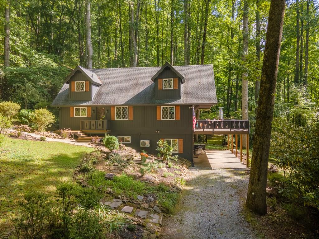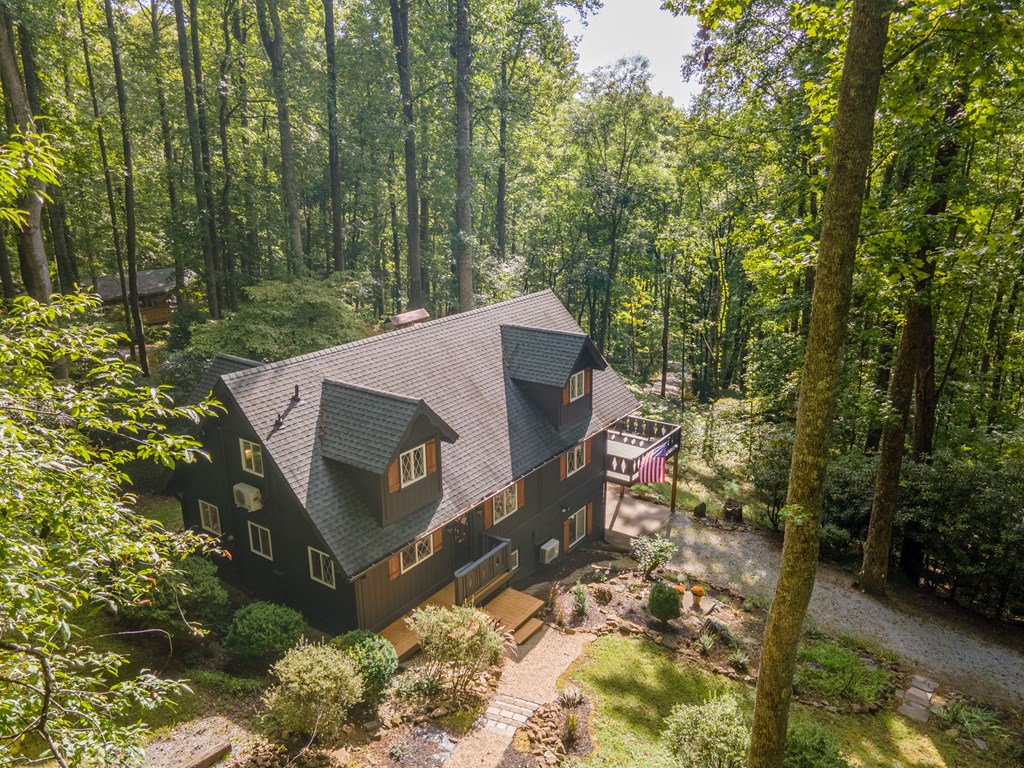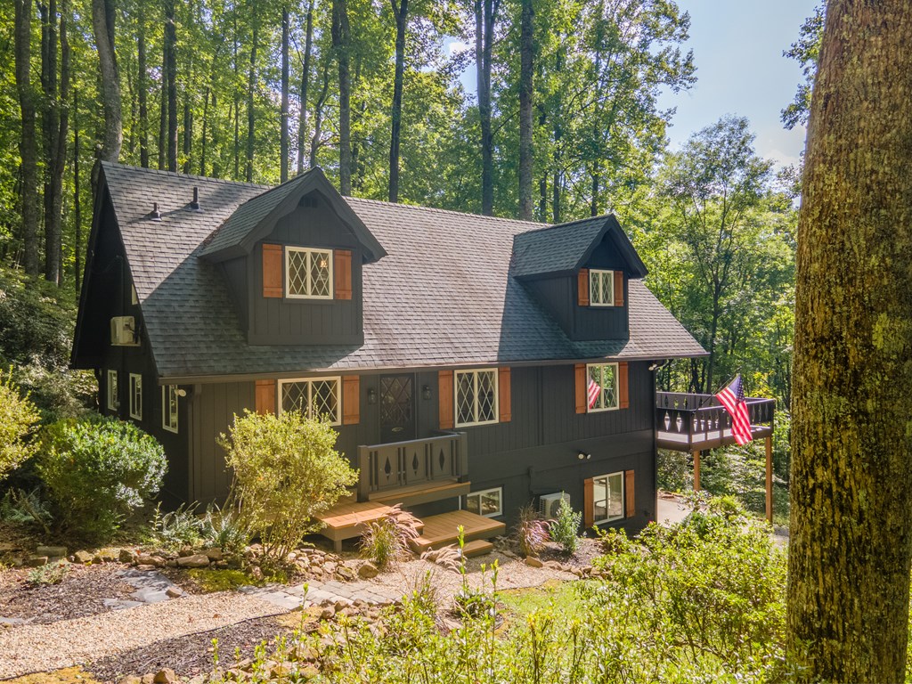 Modern-farmhouse meets cozy-cabin in this updated mid-century charmer! Welcome to Deer Run Cottage- a 3/3 home w/wonderful floorplan for comfortable mountain living & entertaining. Main level is open w/spacious living/dining area that leads to a large relaxation deck. A functional & updated kitchen boasts a separate butler's pantry w/beverage fridge & buffet bar- perfect for mixing cocktails or coffee concoctions! In the wintertime, the cozy wood-burning fireplace is a delightful focal point. The charming primary suite features attractive beam-work & private coffee deck. A 2ndbedroom on this level is ideal for kids or cheerful office. The large suite on the terrace level is perfect for guest/in-law/teen privacy & has a warm woodstove. Updated full baths are located on each level. The storybook setting is well-landscaped w/rock paths and mature azaleas & rhododendrons. The house boasts upper & lower driveways access off of paved roads. This unique property is in a desirable gated community offering scenic picnic spots, clubhouse & enchanting "Lake Tippecanoe"! Long list of recent updates is available from your agent. Vacation rentals are allowed making this home a smart investment!